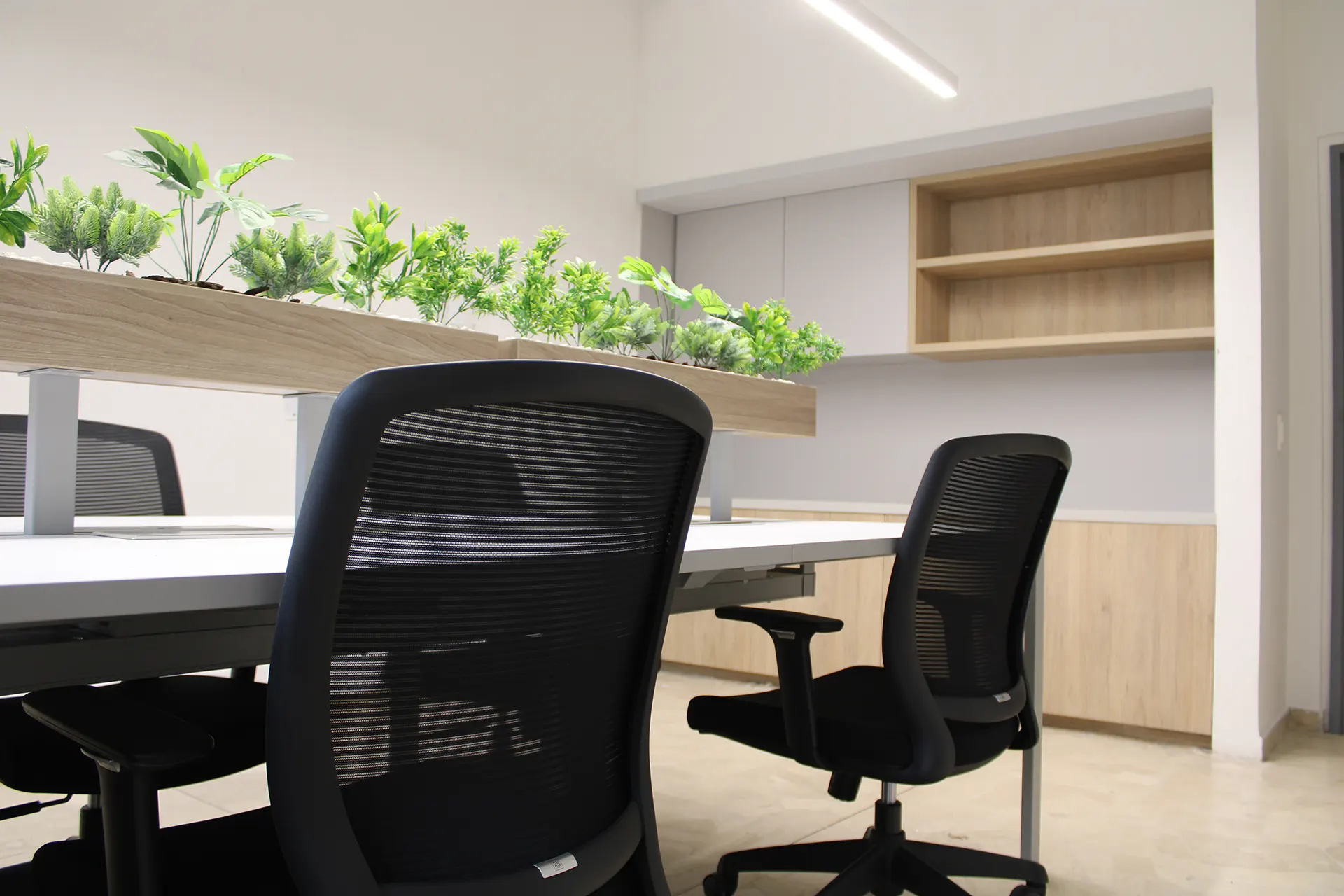 Office with ergonomic furniture and private or shared amenities.